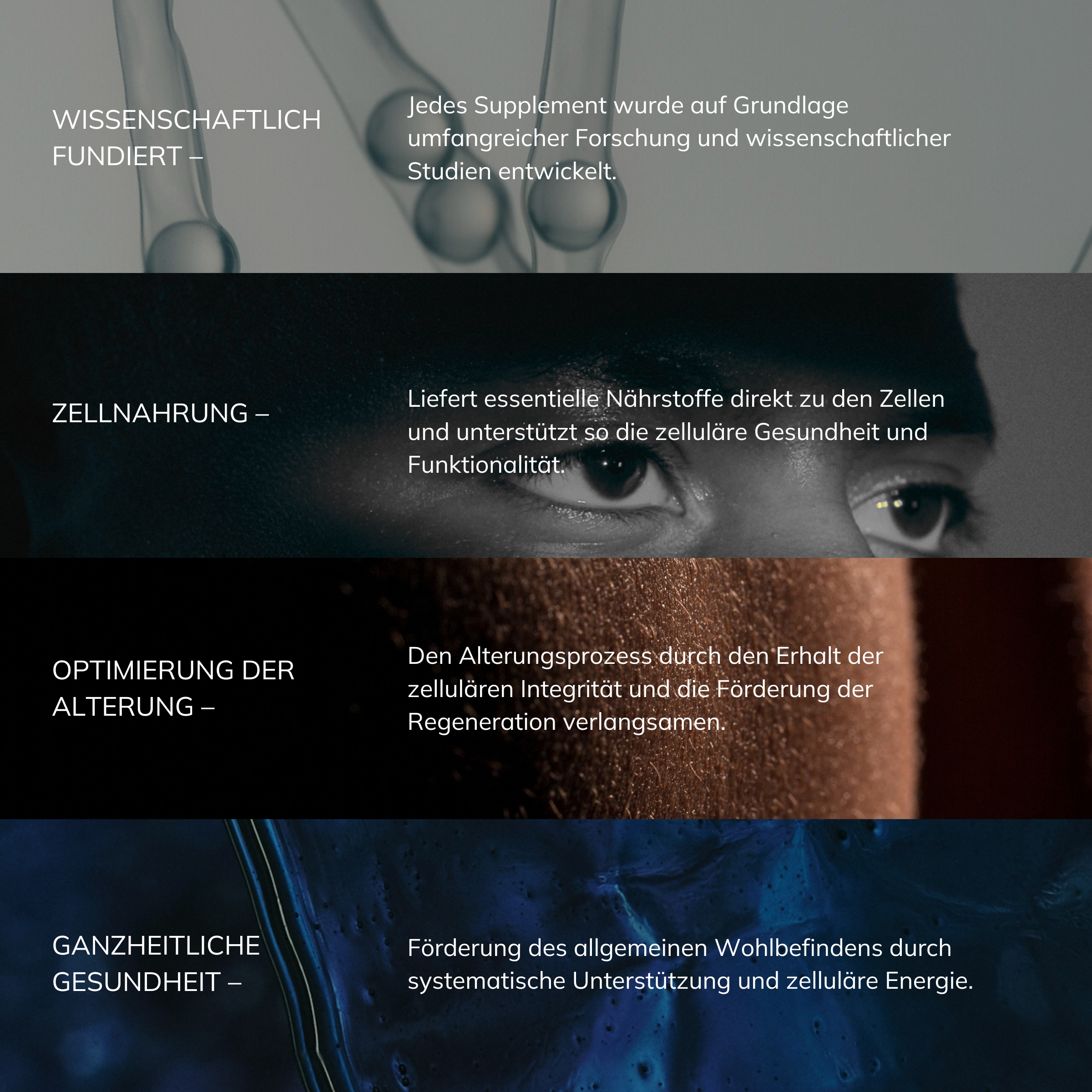 Neueste wissenschaftliche Erkenntnisse zeigen die entscheidende Rolle von Supplements bei der Förderung von Longevity. Nährstoffe können sich auf zellulärer Ebene direkt auf den Alterungsprozess auswirken. Wir befürworten zwar einen Ansatz, bei dem die Ernährung an erster Stelle steht, doch Supplements bieten wissenschaftlich fundierte Dosierungen, um Defizite auszugleichen oder sogar den Spiegel wichtiger Moleküle aufzufüllen und damit Alterszeichen zu verzögern.