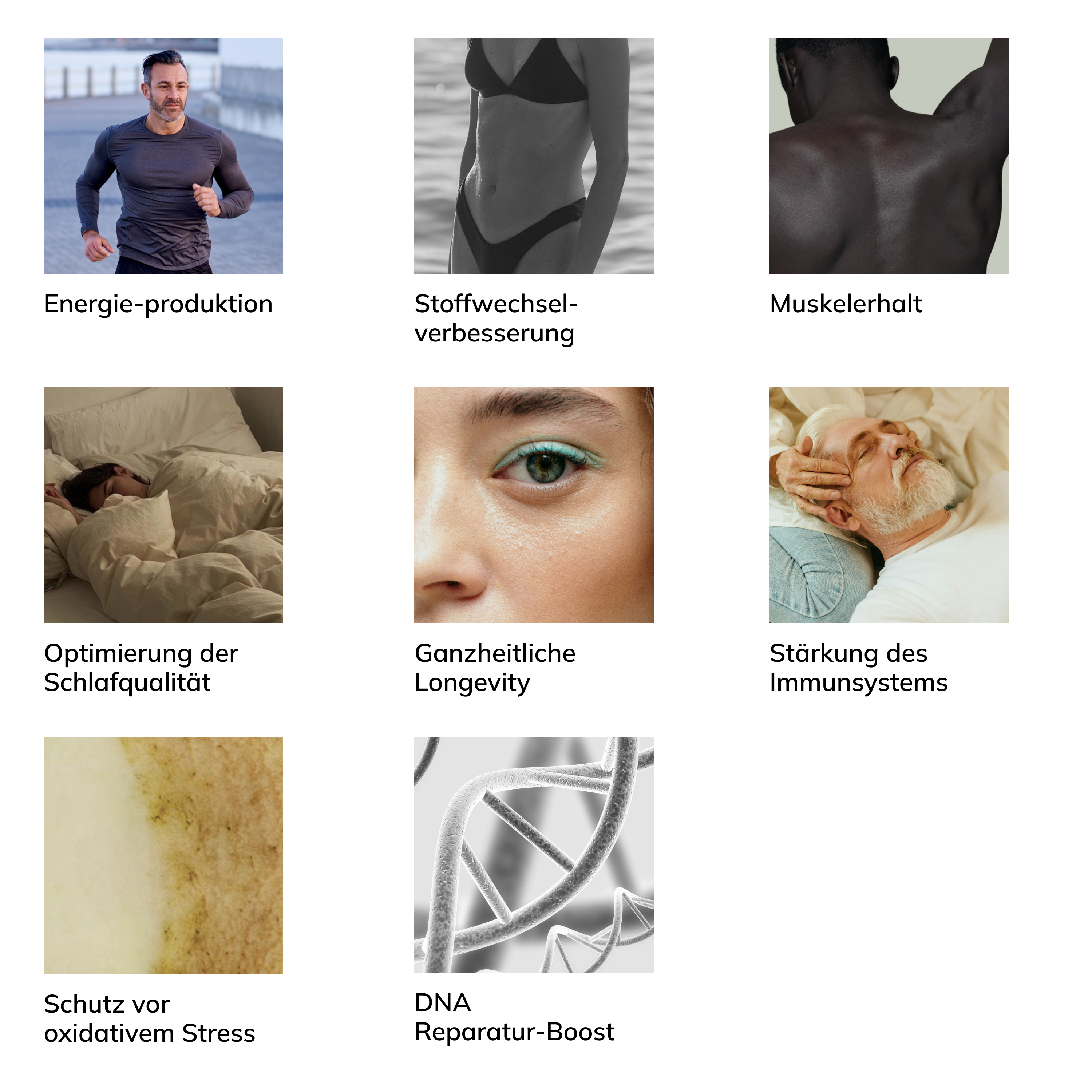 NAD+ ist ein wichtiges Coenzym, das in jeder Zelle vorkommt und für den Energiestoffwechsel, die DNA-Reparatur und die Genexpression wichtig ist. Ein höherer NAD+-Spiegel steht im Zusammenhang mit Longevity und einem geringeren altersbedingten Abbau. Mit zunehmendem Alter oder bei bestimmten Lebensstilen nimmt NAD+ jedoch auf natürliche Weise ab und beeinträchtigt lebenswichtige Zellfunktionen.