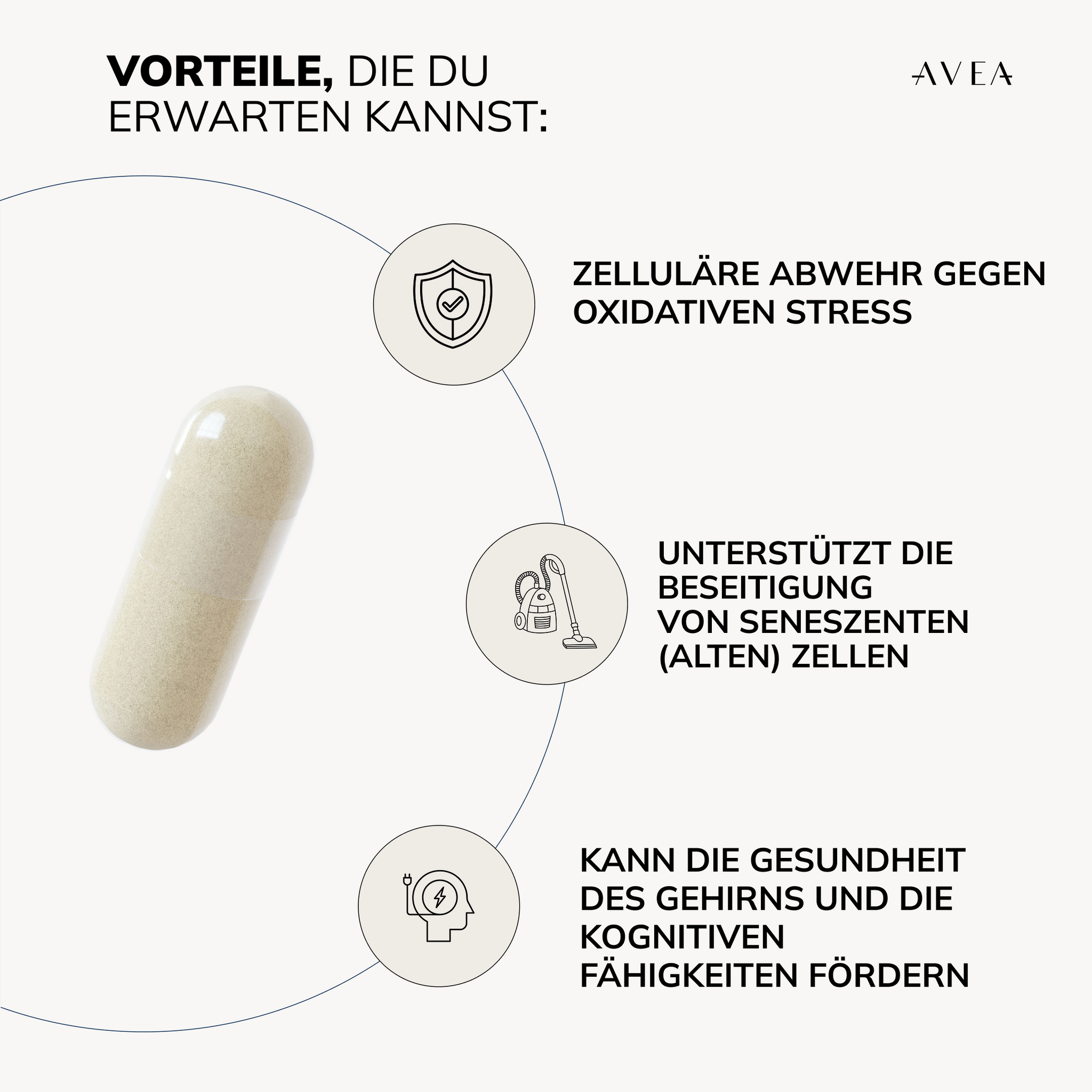 Spermidin, eine natürliche Verbindung aus Weizenkeimen, aktiviert die Autophagie – den Prozess, bei dem beschädigte Zellbestandteile abgebaut und repariert werden. Das hält Zellen länger funktional und widerstandsfähig – und beugt altersbedingten Schäden und chronischen Entzündungen effektiv vor.