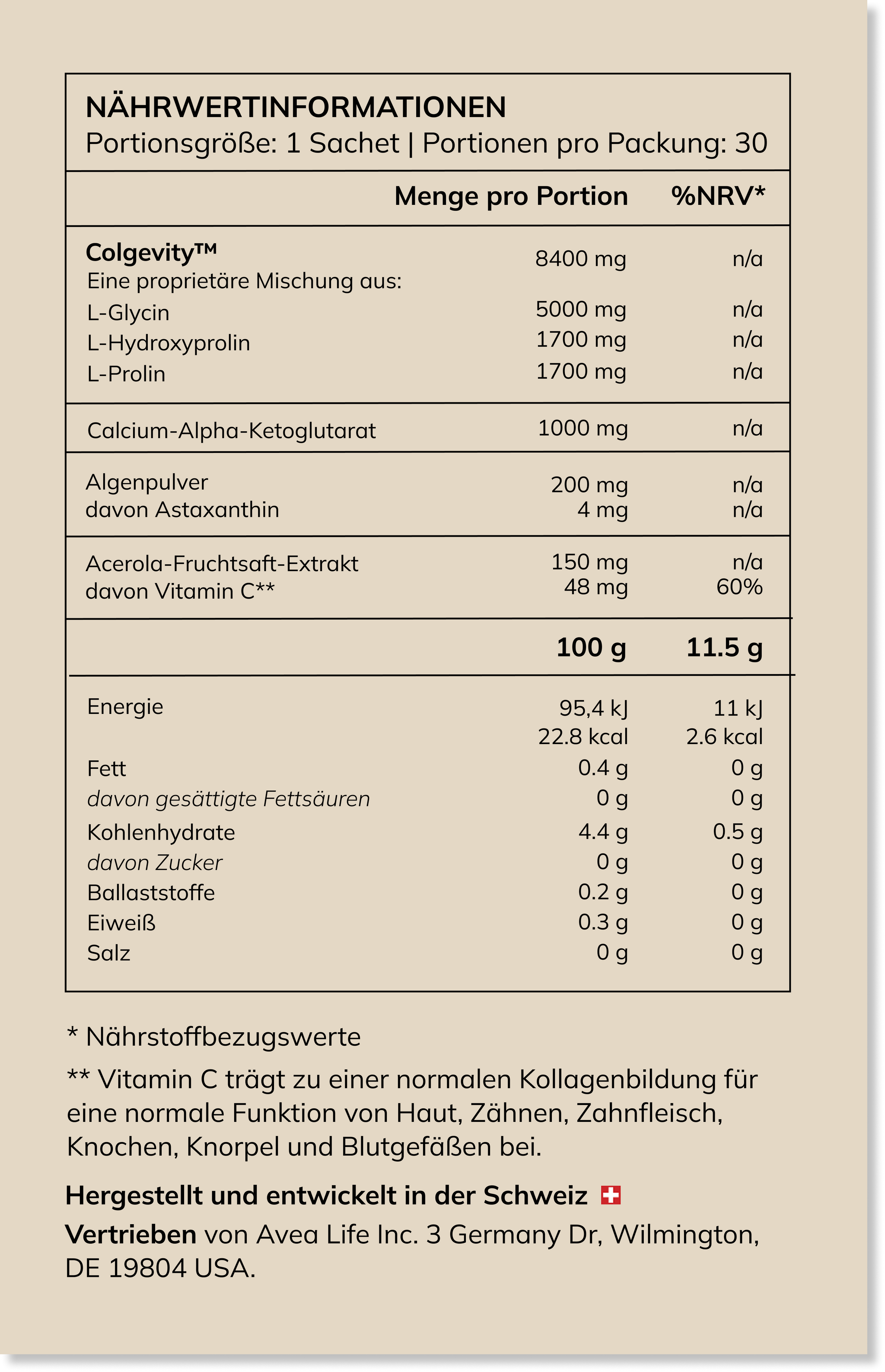 Active ingredients: Colgevity™ 8,400 mg (L-glycine 5,000 mg, L-hydroxyproline 1,700 mg, L-proline 1,700 mg), Calcium Alpha-ketoglutarate 1,000 mg, Algae Powder 200 mg (as Astaxanthin 4 mg), Acerola fruit juice extract 150 mg (provides vitamin C 48 mg)