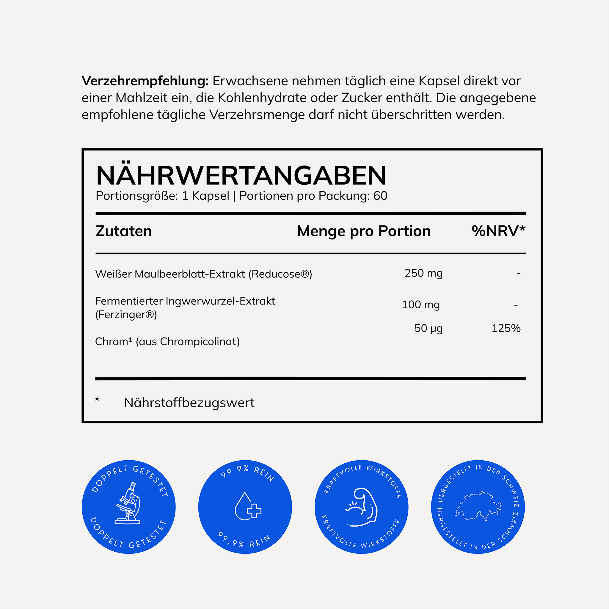Reducose® (Extrakt aus weißen Maulbeerblättern), 250 mg, Ferzinger® (fermentierter Ingwerextrakt) 100 mg, Chrom (aus Chrompicolinat) 50 µg