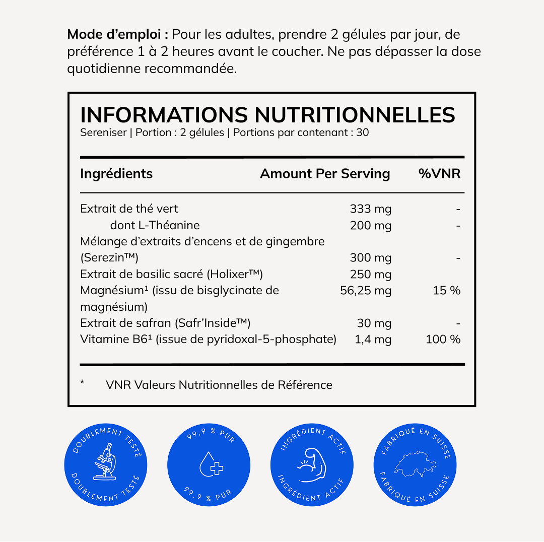 Sereniser combines Serezin™, Magnesium Glycinate, and Vitamin B6 + Safr’Inside™ to support all phases of sleep – from onset to deep rest. Serezin™ helps reduce nighttime discomfort, Magnesium Glycinate relaxes muscles and nerves, while B6 and Safr’Inside™ promote natural melatonin production – supporting deeper, more restorative sleep and improved next-day focus.