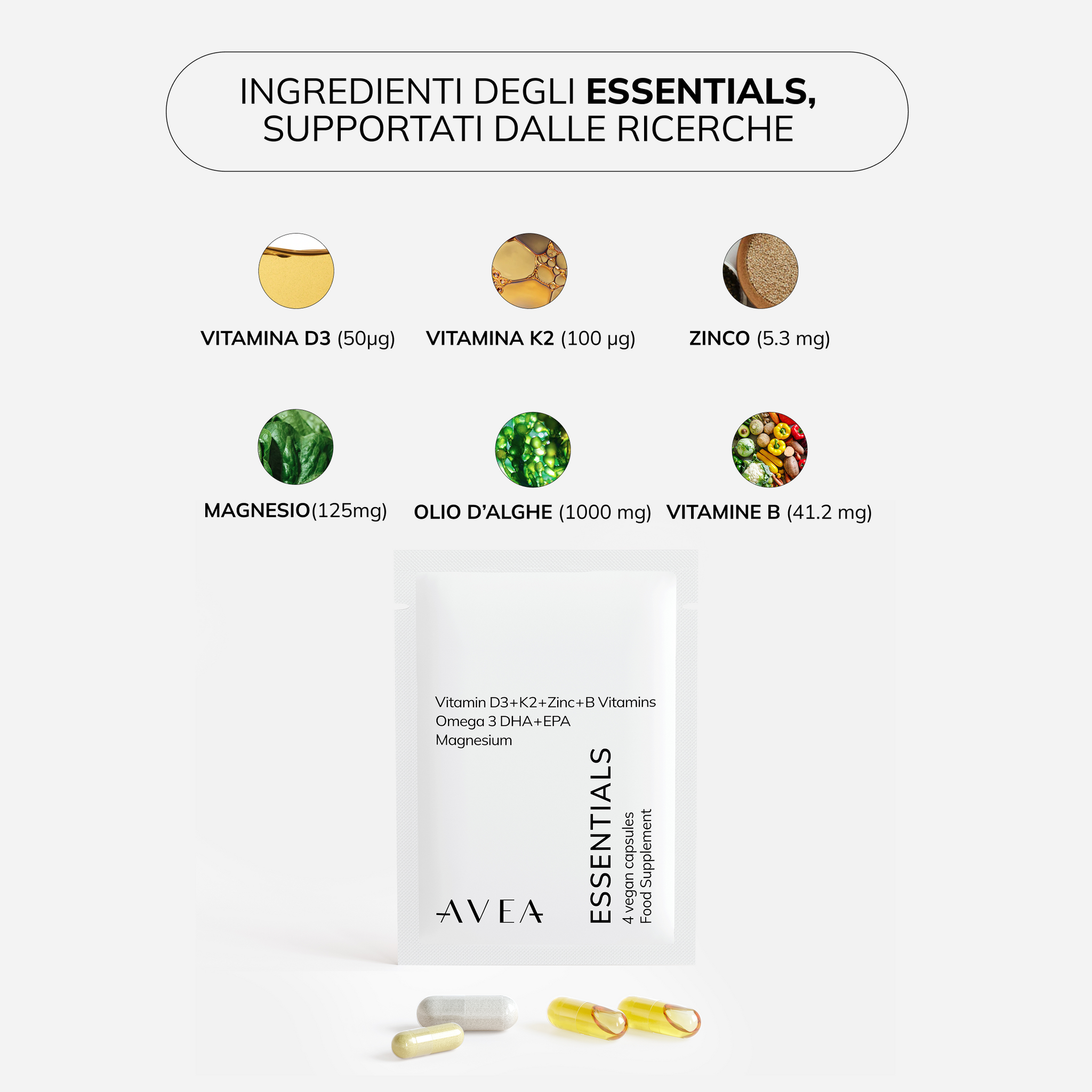 AVEA’s Essentials deliver your daily supply of six core nutrients – in one convenient, vegan-friendly pack.