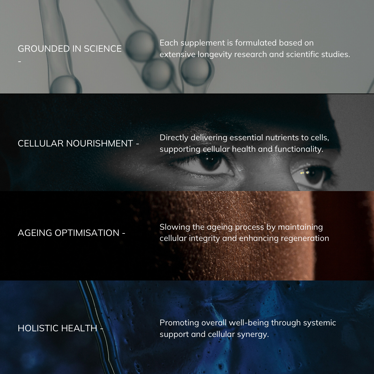 Latest science findings reveal the crucial role of supplements in promoting longevity. Nutrients can directly impact healthy-ageing pathways at the cellular level. Though we support a diet-first approach, supplements offer science-based doses to offset deficiencies or even replenish levels of crucial molecules, delaying the signs of ageing.