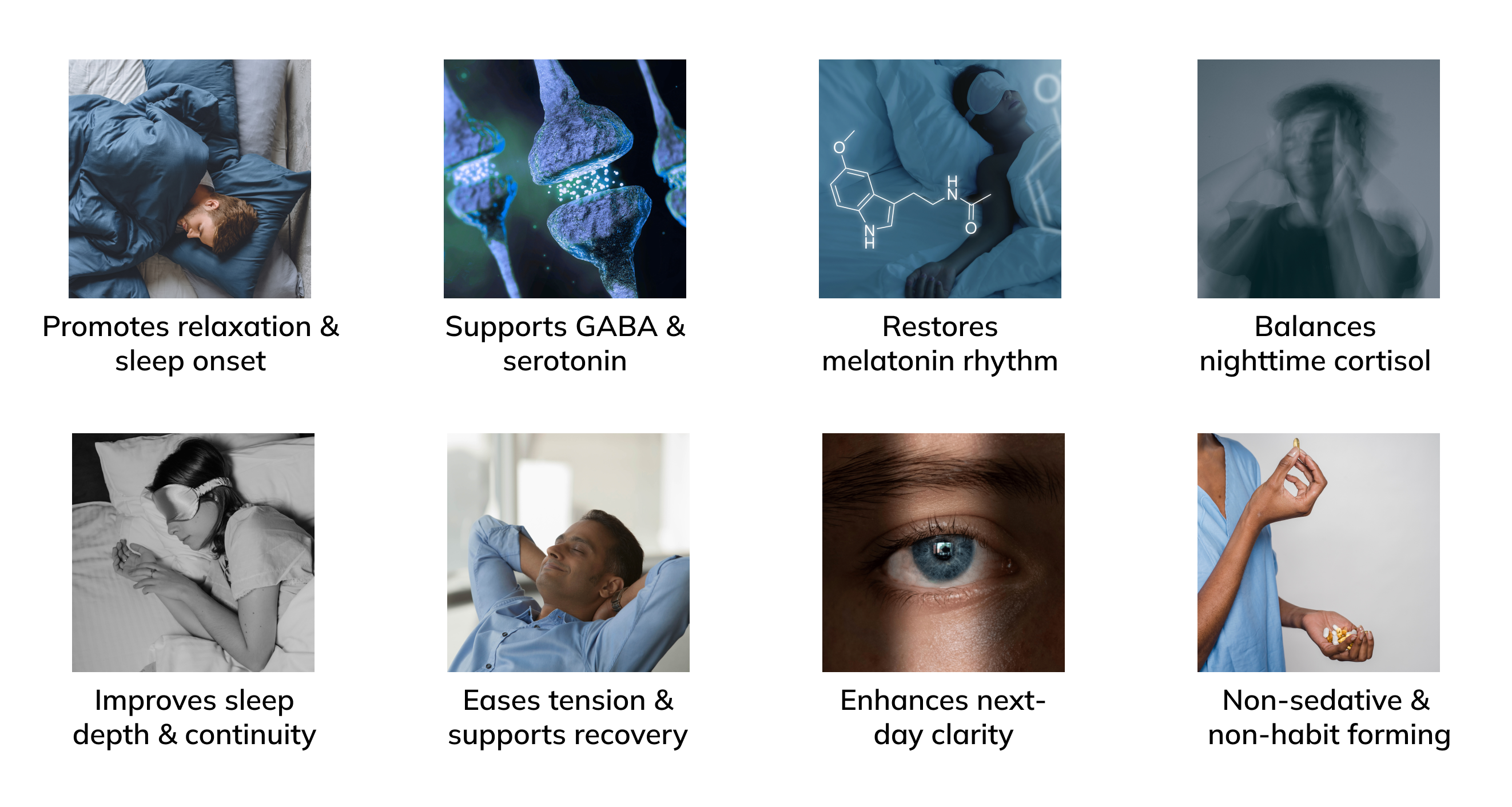 Many people don’t struggle to fall asleep — they struggle to stay asleep. Mid-night wakeups are often caused by cortisol spikes, restlessness, or dysregulated sleep rhythms. The Sereniser targets these pathways with Holixer™, a plant-based extract of holy basil that has been clinically shown to reduce perceived stress and help stabilise nighttime cortisol levels. Safr’Inside™ supports ongoing serotonin–melatonin balance, while Serezin™, a botanical complex of ginger and boswellia, helps reduce nighttime tension and physical discomfort — two subtle but powerful disruptors of continuous sleep.
