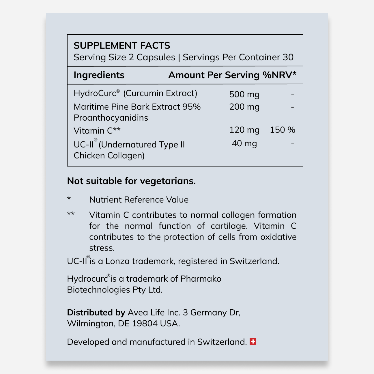 HydroCurc® (Curcumin Extract) 500mg, Maritime Pine Bark Extract 95% 200mg, Vitamin C 120mg, UC-II® (Undenatured Type II Chicken Collagen) 40mg
