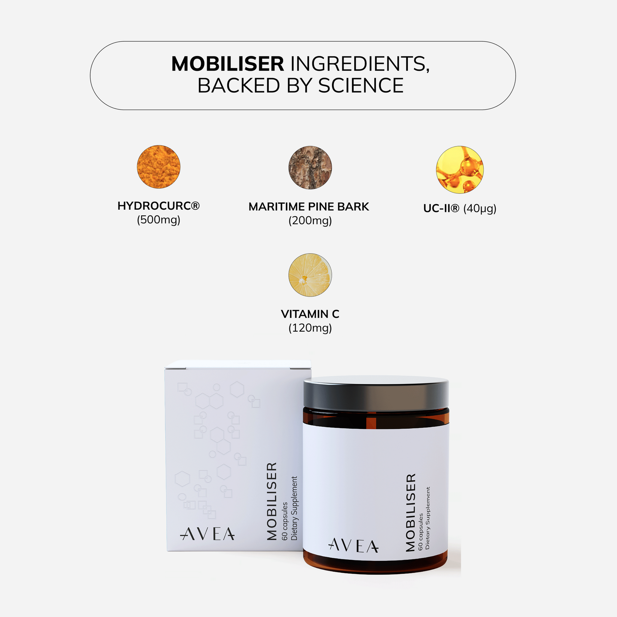 The active ingredients in AVEA’s Mobiliser - UC-II® (undenatured type II collagen), Hydrocurc® curcumin, and Pine Bark Extract - are specifically formulated to support both joint health and muscle recovery.